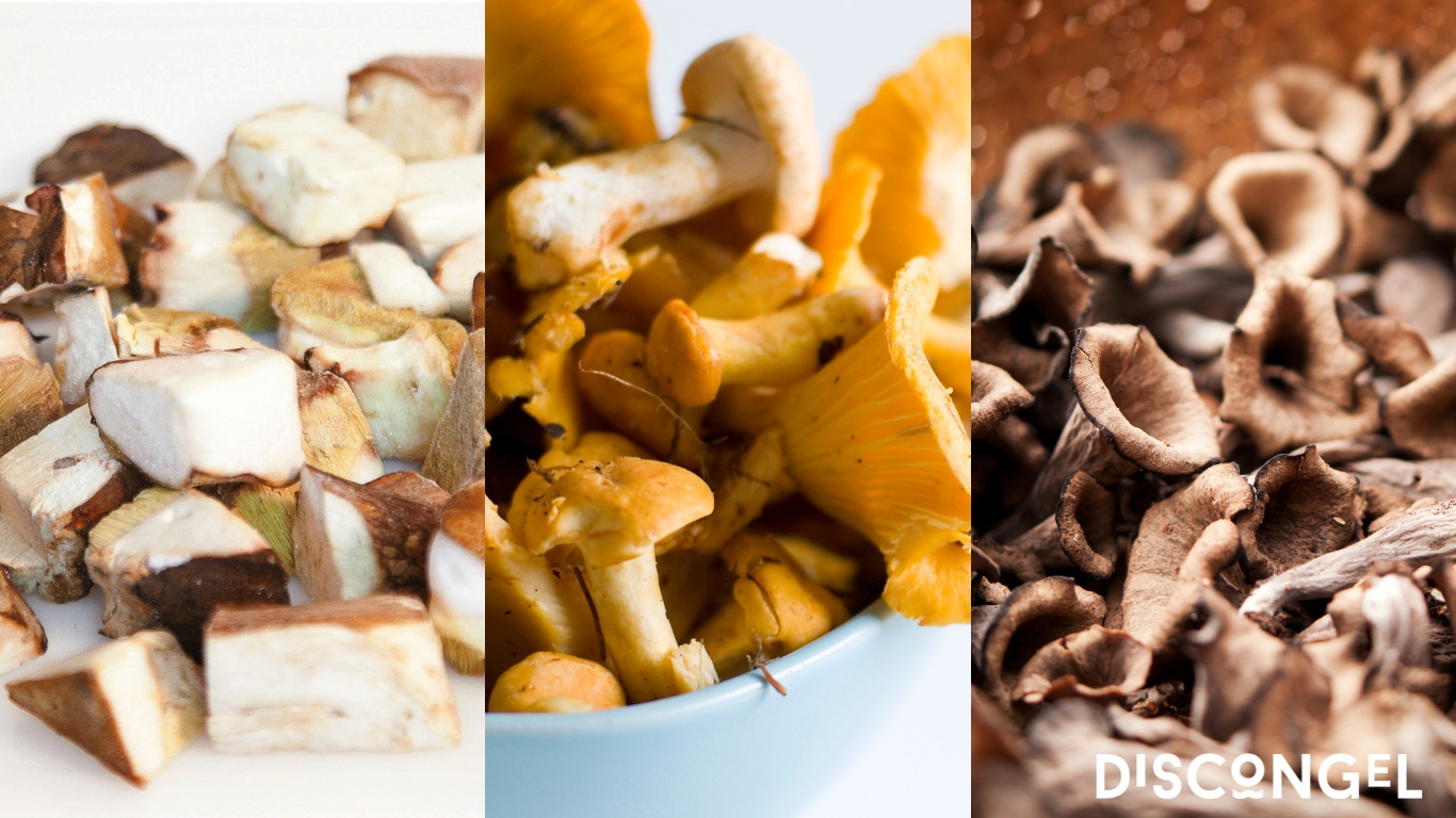 Nets, trossejats i a punt per saltar a la paella: variat bolet xef, rossinyol trossejat, trompeta de la mort i cep tallat a trossos. Bolets que aporten gust, aroma i color a qualsevol plat, amb la màxima practicitat.